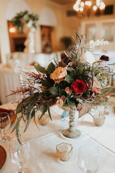 Beautiful glass compotes overflowed with lush fall greenery, and flowers in rich cream tones with accents of ruby and burgundy.