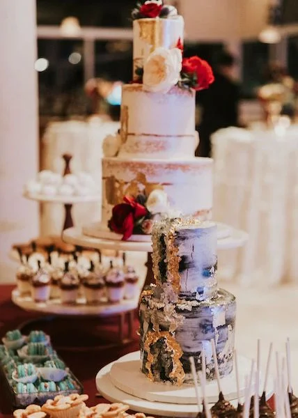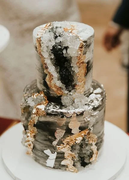 After an amazing evening of dinner and dancing the couple cut this spectacular three-tiered naked wedding cake brushed with gold leaf and accented with a few perfectly placed flowers.